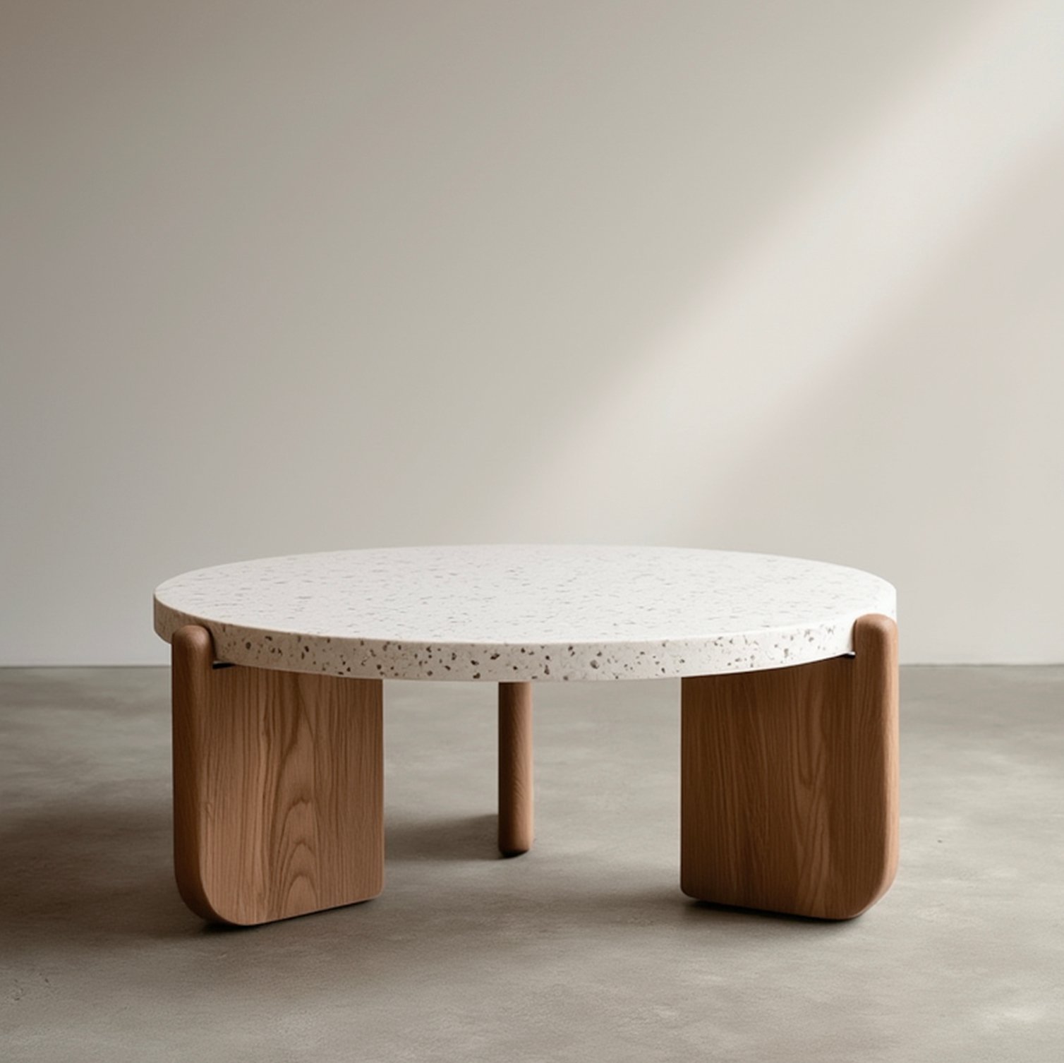 La Mesa Lugo presenta una cubierta de terrazo sólido y patas de madera con líneas y formas simples.